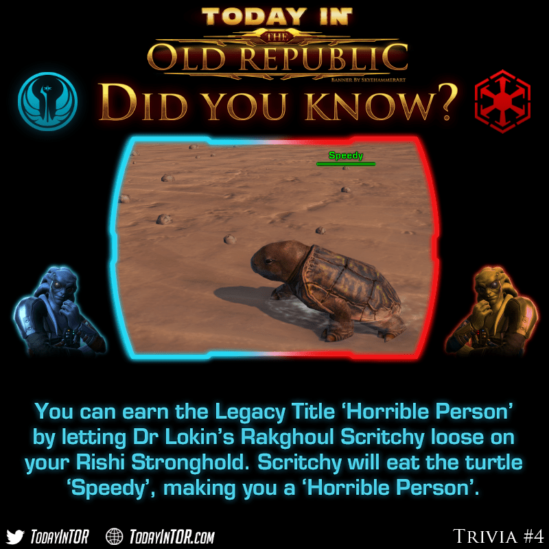 On your Rishi stronghold you can find a pet turtle called Speedy that wanders the beach. If you wish to permanently remove them from your Rishi stronghold and earn the ‘Horrible Person’ achievement title, head on over to your Odessen Alliance base (Kotfe Chapter 9+) after you have completed Dr. Lokin’s Alliance Alert.