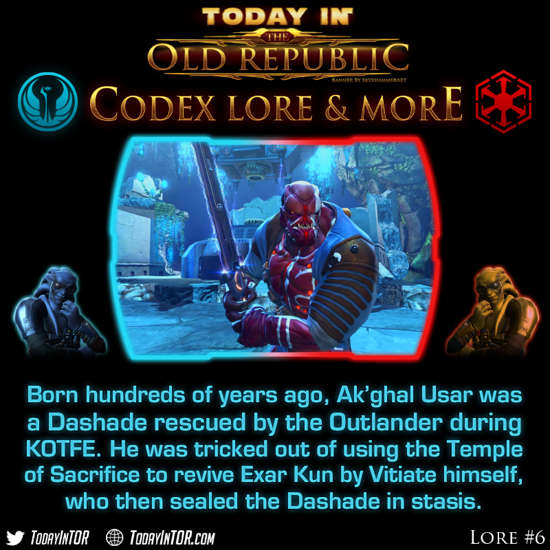 Several hundred years before the Treaty of Coruscant, a cataclysmic event known as Cron Drift caused by Sith meddling lead to the complete and utter annihilation of the Dashade homeworld of Urkupp. Ak’ghal Usar himself was one of the only survivors of his now lifeless homeworld.