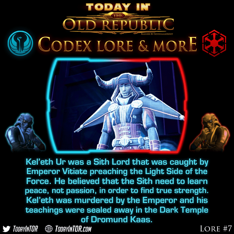It would not be for nearly thousand years later that Kel’eth’s teachings would be discovered again by the Imperial characters on Dromund Kaas. Where the Imperial characters had been tasked by Sith Lord Alaric to go within the Dark Temple of Dromund Kaas and search for remnants of Kel’eth’s teachings.