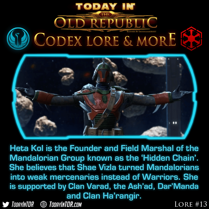 Currently, Shae Vizla and the Eternal Alliance are tracking the exploits of Heta Kol and the Hidden Chain across the galaxy but have yet to find them or return the banner of Clan Cadera.