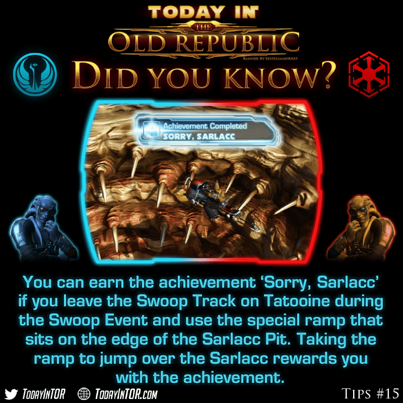 This achievement is pretty straight forward. Once you land on Tatooine for the All Worlds Ultimate Swoop Rally event and start as any of the teams, you can turn around and beeline North-West to the Sarlacc Pit!