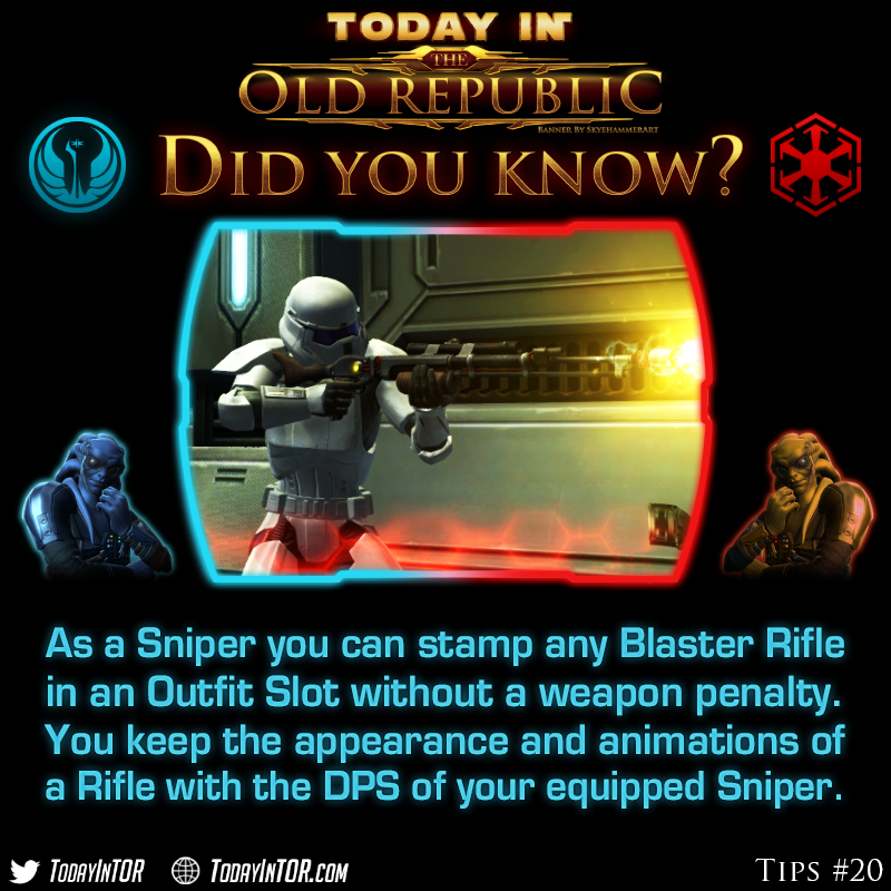 While experimenting with SWTOR’s new 7.0.2 Weapons in Outfit Designer feature, I, like many others players came to the realization that you can continue to Snipe uninterrupted while you have a Blaster Rifle stamped into your active outfit!