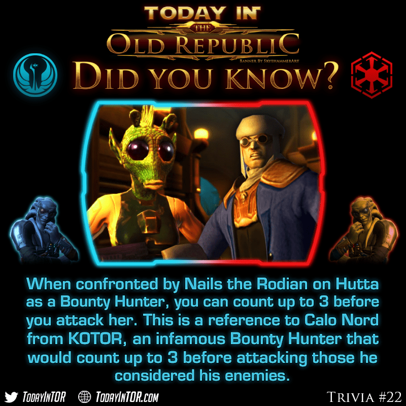 Within Nemro’s Palace on Hutta during the Bounty Hunter storyline in SWTOR you encounter an irritating Rodian Bounty Hunter called Nails. Pressing your character with insults as she approaches you, you have the option to say “I’m going to start counting”, and as she continues to insult you, your character can count up to 3, while your character continues to get angrier at the Rodian.