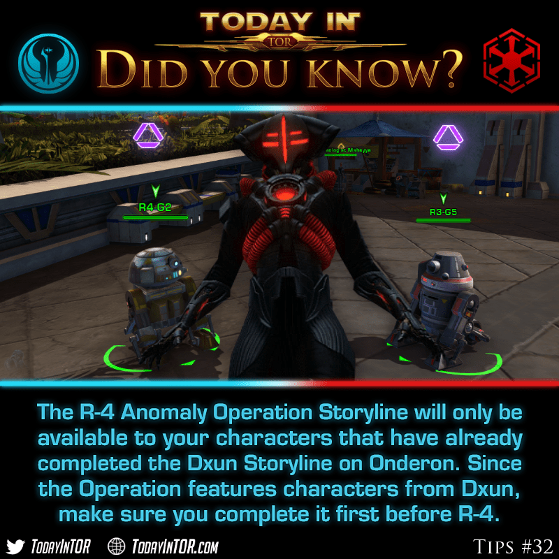As per the official SWTOR livestream held on the 28th of July, Bioware has revealed that in order to unlock the new R-4 Anomaly’s Storyline with cutscenes and dialogue, you must first complete the Dxun Operation storyline on Onderon beforehand.