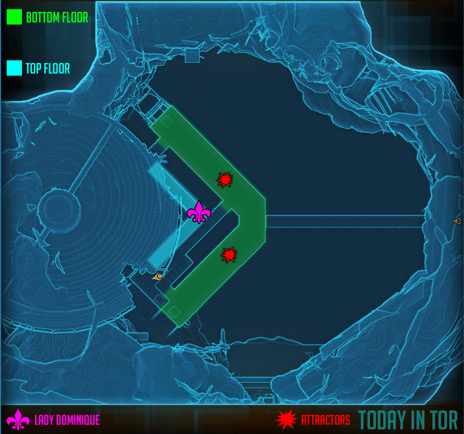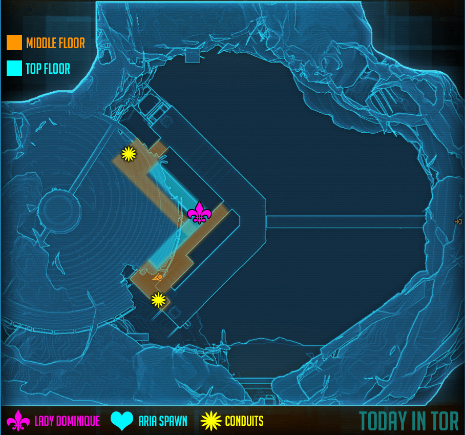 The bottom floor is where you enter, it contains 1 Conduit Generator on each end and is the floor where attractors and ARIA will spawn later in the fight.
