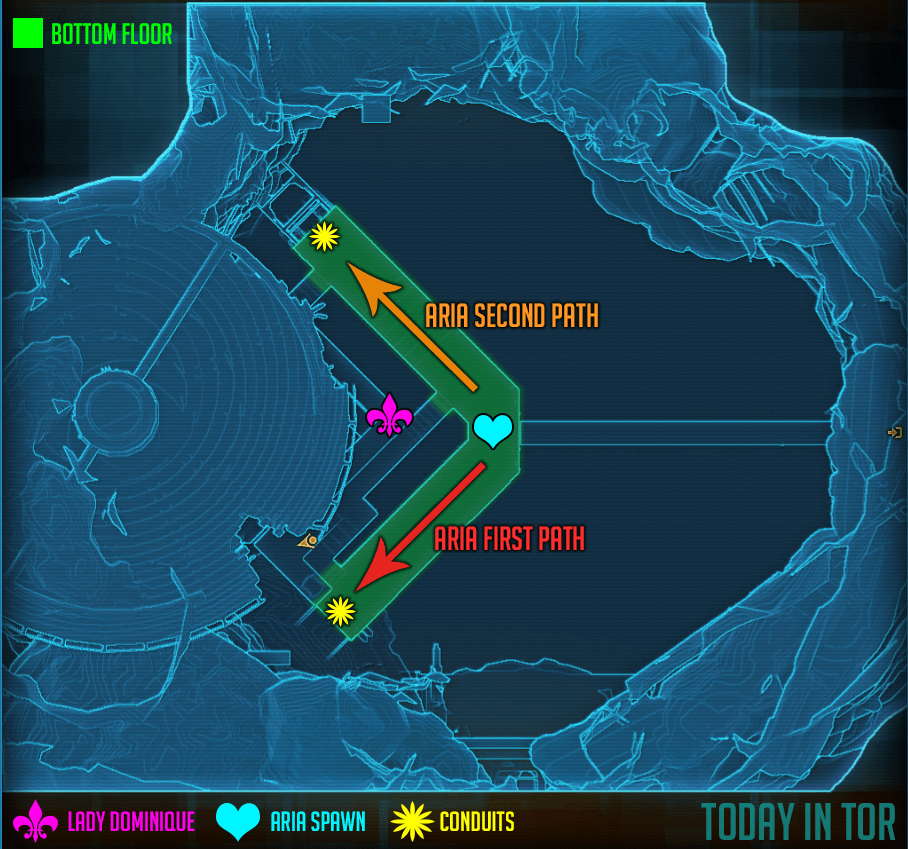 When ARIA spawns she will start at the center of the Bottom Floor and travel South to the Souther Conduit Generator. To make sure she is defended, have the Tanks both stand facing the Upper Floor catwalk towards the North Generator with all DPS and Healers tucking in melee range of Lady Dominique facing either the MSG or the South catwalk. Both tanks will need to watch Dominique’s threat and keep her LOS’d of ARIA at all times, swapping taunts if needed.