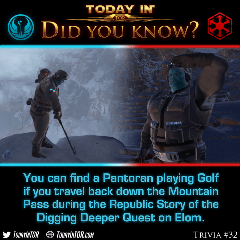 Game Update 7.1 added a bunch Easter Eggs hidden amongst new Story locations on Elom, Manaan and the R-4 Anomaly! The most secretive of NPCs are a pair of Golfers and their caddy droids that you can find on both the Republic and Imperial versions of the “Digging Deeper” Story quest while you’re at the Elom Digsite.