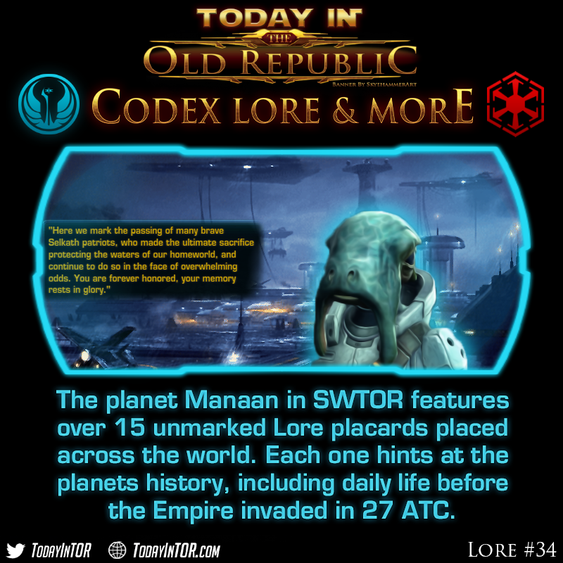 The earliest instances of unmarked Lore items on Manaan began in Shadow of Revan, with four Placards placed around the small hub that housed the Depths of Manaan flashpoint and concourse with Lana and Theron.