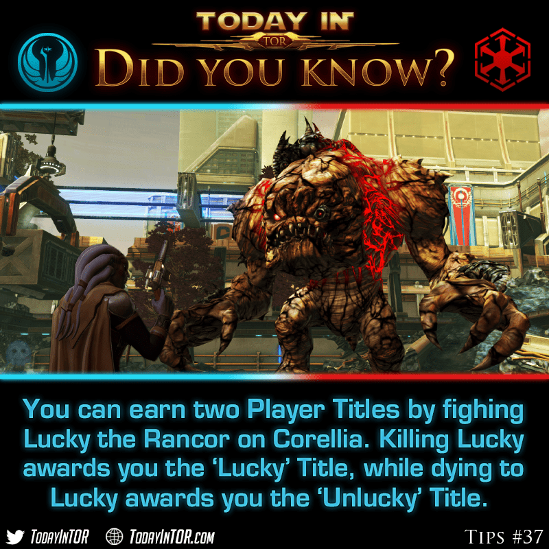 Lucky was once a regular brown Rancor until Rise of the Hutt Cartel introduced the Dread Seed corruption to various planets in the game, which corrupted both Lucky and his enclosure. You are able to earn both of the Worldboss’ titles on the same character as Lucky has a roughly 15 minute respawn (may be faster if the Feast of Prosperity Event is running). Keep in mind both titles are “Character Bound” meaning that to unlock the titles on your alts you must re-do the Boss on those characters.