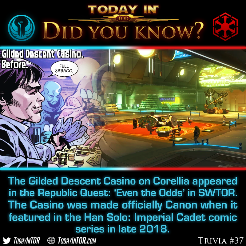The Gilded Descent Casino appears near the Republic Spaceport on Corellia in the Blastfield Shipyards sector. It was most prominently featured in the vanilla-era Republic quest “Even the Odds” in which Republic faction players may help the Casino’s owner Hannak Vrish restore the Casino’s security camera system after the Sith Empire hacked them.