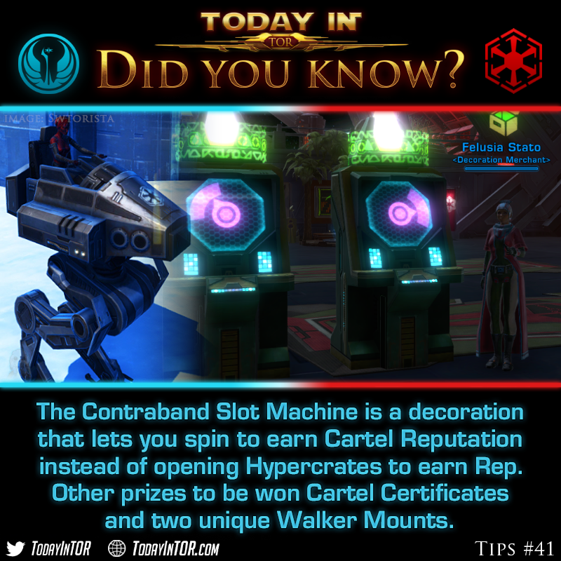 The Contraband Slot Machine is a decoration that you can buy from the GTN for a billion credits or a flat price on the Cartel Market for 1,500 Cartel Coins. Unlike all other decorations this is the only interactable decoration that provides loot and rewards, and as such is usually in demand.