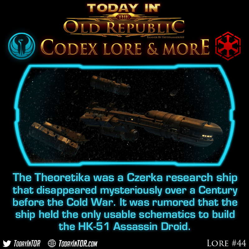 It is unknown as to what caused the catastrophe that doomed the Theoretika and its 51 crew, as it was only recently rediscovered when Heroes of the Republic and Empire (player characters) tracked down it’s location after discovering the Fatality on Belsavis. An old Sith Warship that contained dozens of deactivated and destroyed or damaged HK-51 Series Assassin Droids.
