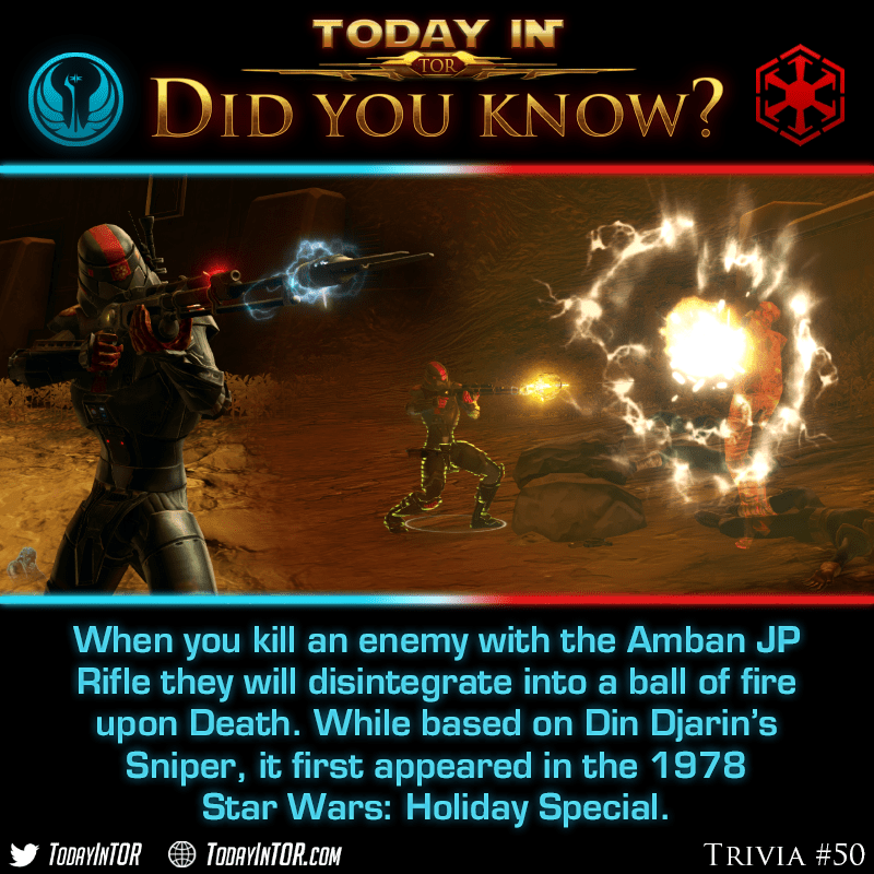 The Amban JP Rifle is a weapon usable by Vanguards, Operatives and Snipers in both the Mainhand Weapon Slot and Outfit Slot. Unlike other Blaster Rifles in SWTOR, the Amban JP is completely unique in that upon killing any enemy in the game, they will explode in a ball of fire and the body will completely disintegrate. Don’t worry, you can still loot them.