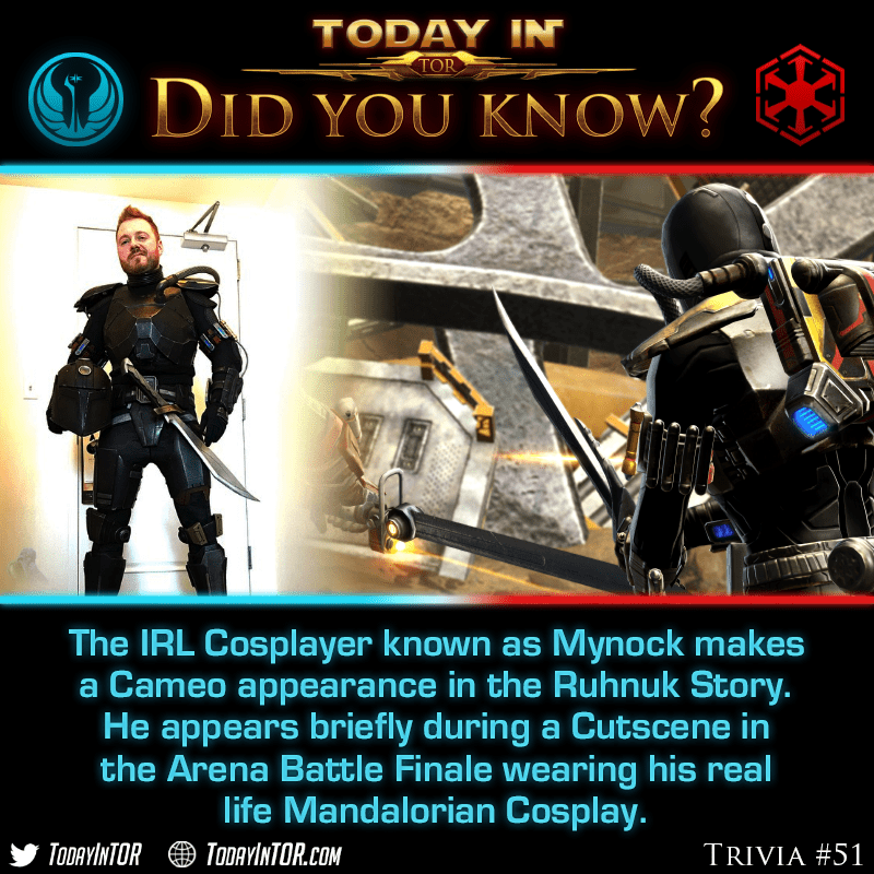 Mynock is a famous Mandalorian Cosplayer known within the community for creating super high quality SWTOR themed cosplay props and helmets. He was first added to SWTOR as a Cameo Character during Chapter 14 of KOTFE 5 years ago in recognition from the developers.