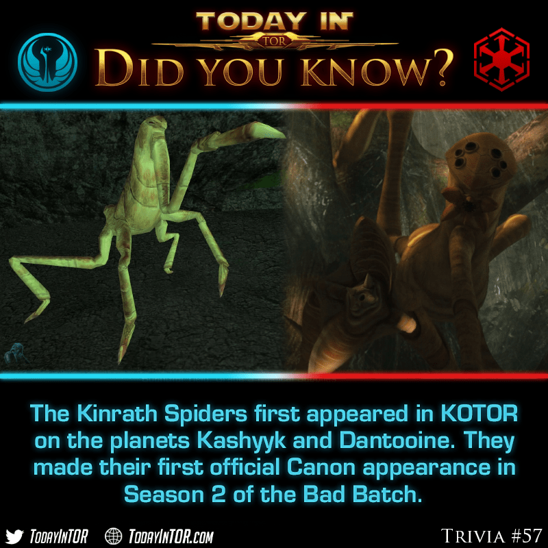 The Kinrath Spider is an arachnid creature with a long single probing/spike arm similar to that of a Scorpion but at the front. It was created for KOTOR 1 two decades ago as an animal creature to appear on both Dantooine and Kashyyk. While the spider has been referenced in both SWTOR and the new Canon since its creation, it was not ever physically seen until the Bad Batch’s 6th episode of Season 2.