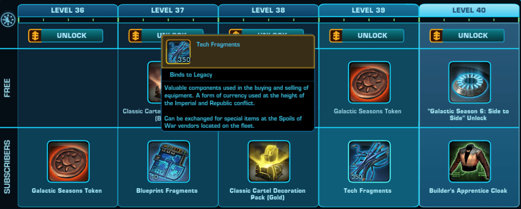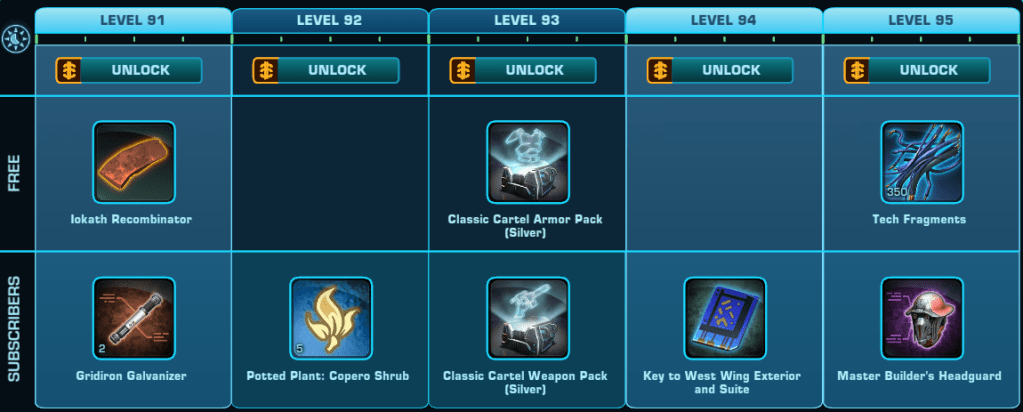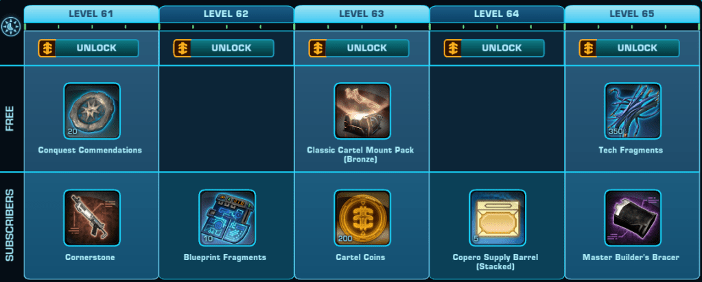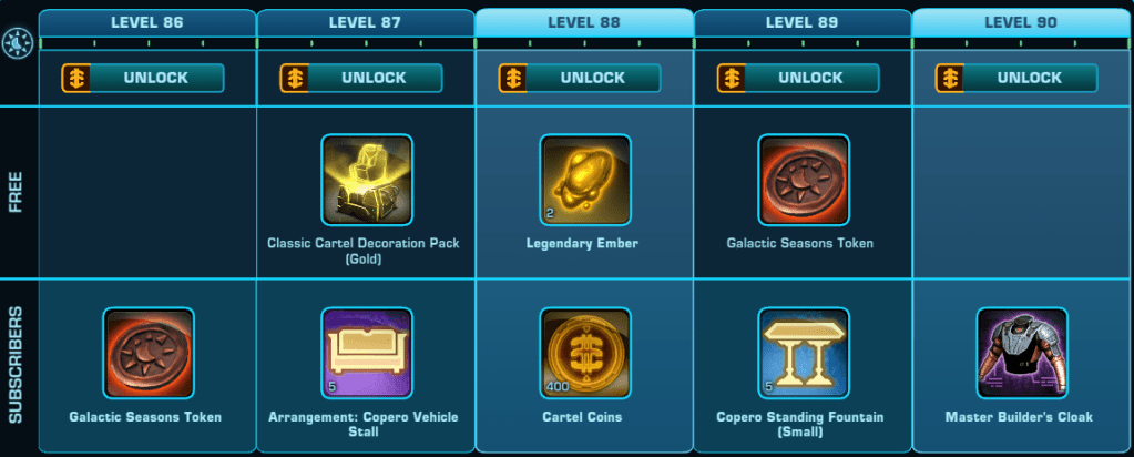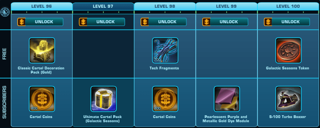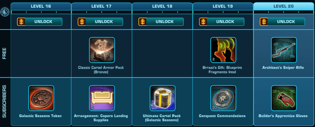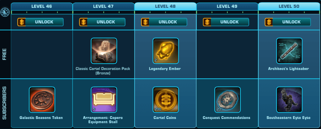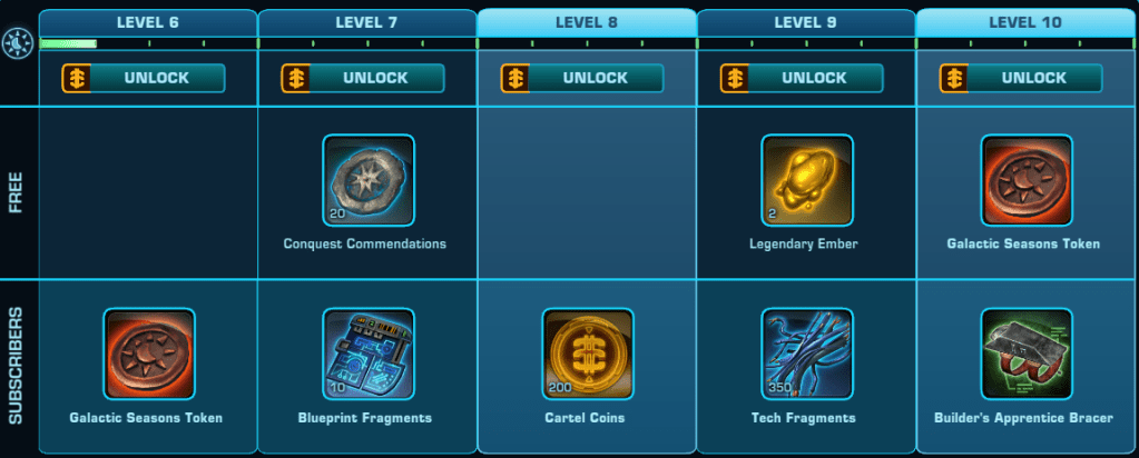Here is a Master List of all of the Rewards available to anyone that Subscribes during Galactic Season 6 (On top of the Free rewards). Important rewards have been highlighted.