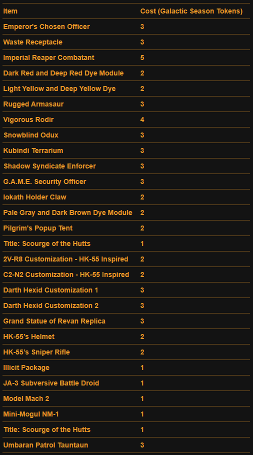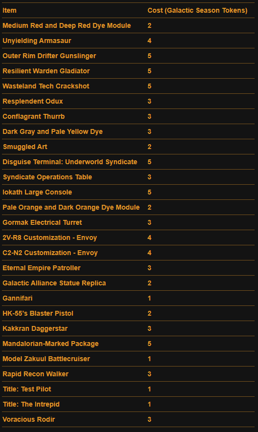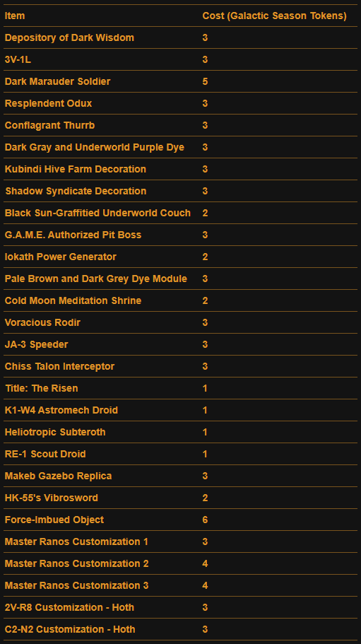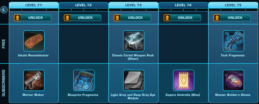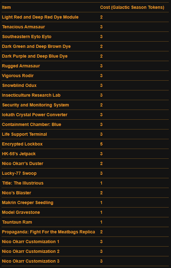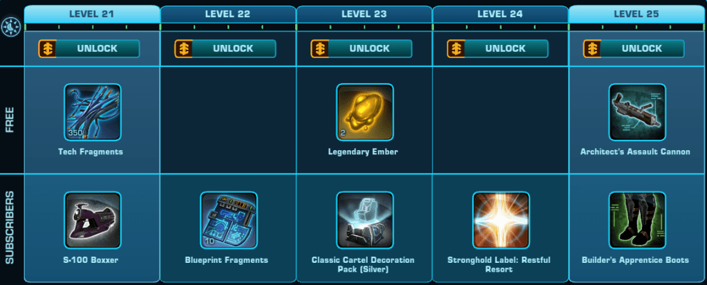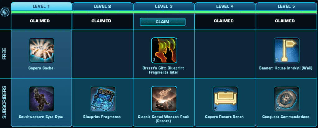 Here is a Master List of all of the Rewards available to anyone that Subscribes during Galactic Season 6 (On top of the Free rewards). Important rewards have been highlighted.