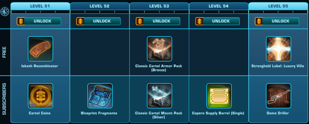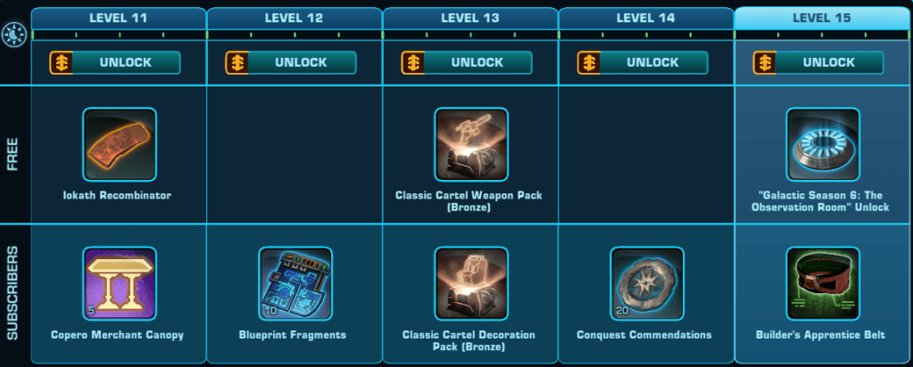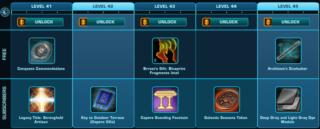 The Copero Stronghold is the Major Free Reward for participating in Galactic Season 6 Building A Foundation. The Stronghold is unlocked at level 1 of the Free to Play rewards track. 3 rooms are unlocked through Story Quests at level 1, 15 and 40. Three more rooms are unlocked through the Subscriber ONLY rewards track at level 42, 67 and 94.