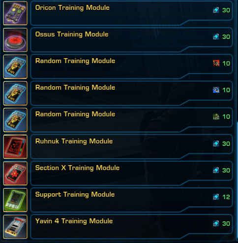 Random training modules can be purchased for either 10 Combat, 10 Support or 10 Defense data and give you both a random role and random daily area.