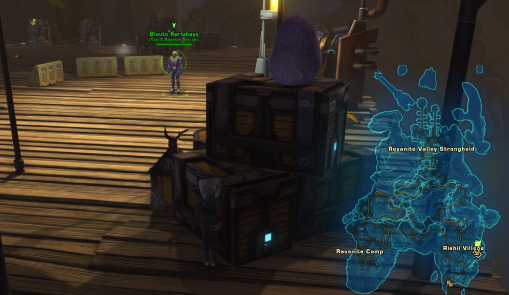 Eggs at the Raider’s Cove on Onderon are most commonly found along the stone walls, in the water or behind crates around the boardwalk, in the plants and bushes around the Cantina building.