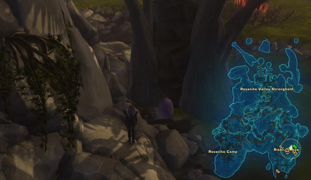 Eggs at the Untamed Territory on Onderon are most commonly found around ruins, underneath large trees and under large bushes and tall grass near the dirt paths. It is common here for multiple eggs to spawn next to each other.