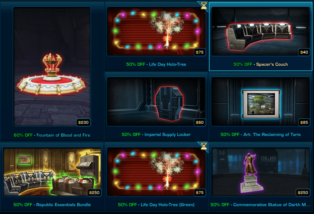 Many items have been discounted between 50% and 90% off in SWTOR. The sale started on the 16th of July and lasts an unknown amount of time.