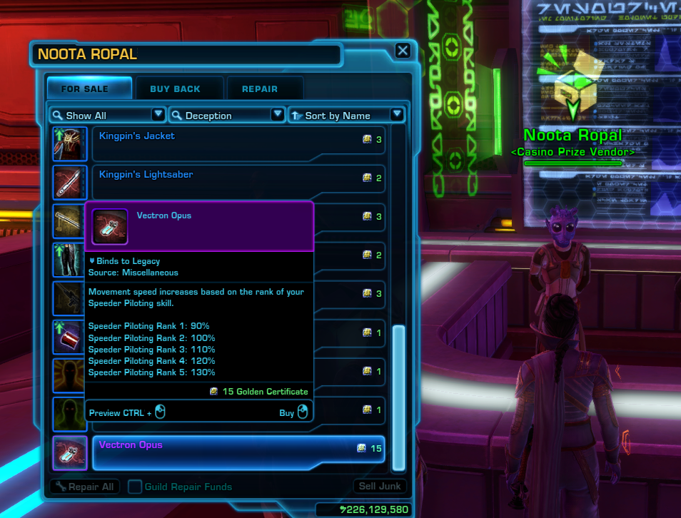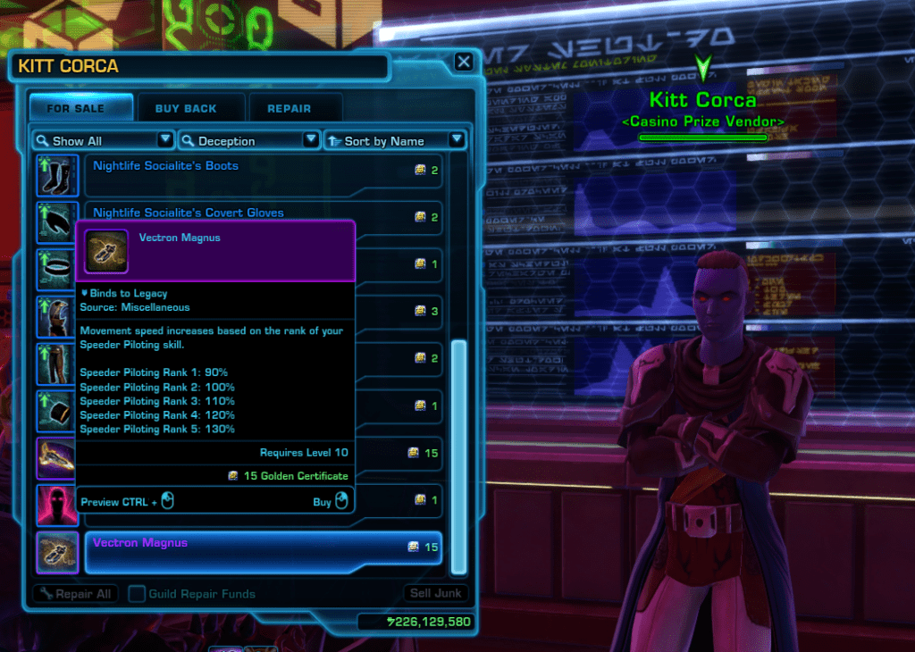Purchase and use the Vectron Magnus from the Casino Prize Vendor for 15 Golden Certificates (also a super-rare drop from Kingpin’s Bounty and Emperor’s Grace or Max Bet slot machines).