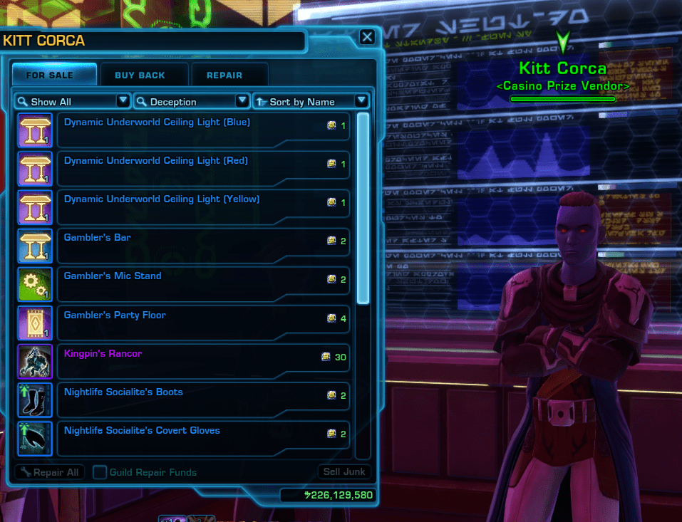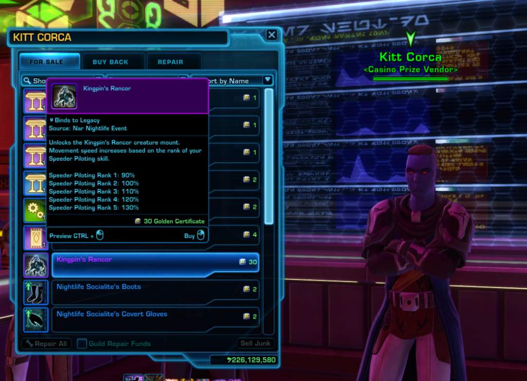 There are many Nar Shaddaa Nightlife Event rewards that can be purchased from the Event Vendor or won from the Slot Machines. Many of the prizes rewarded from the Kingpin’s Bounty and Emperor’s Grace slot machines have achievements for winning them as prizes.