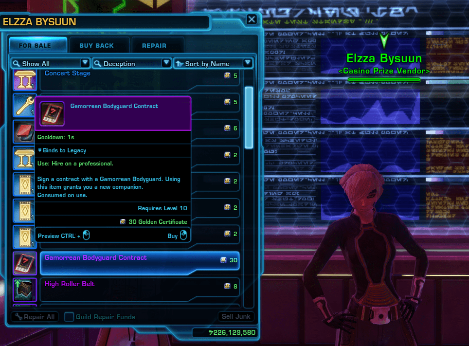 Purchase and use the Companion: Gamorrean Bodyguard Contract from the Casino Prize Vendor for 30 Golden Certificates.