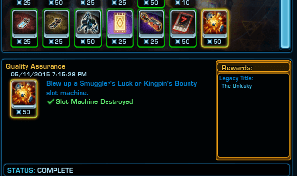 The Quality Assurance achievement is a secret achievement for the Nar Shaddaa Nightlife event in SWTOR. To unlock the achievement you have to explode a Kingpin’s or Smuggler’s slot machine. There is a less then 1% chance of exploding a Slot Machine when you spin so it could take hundreds or even thousands of tries.