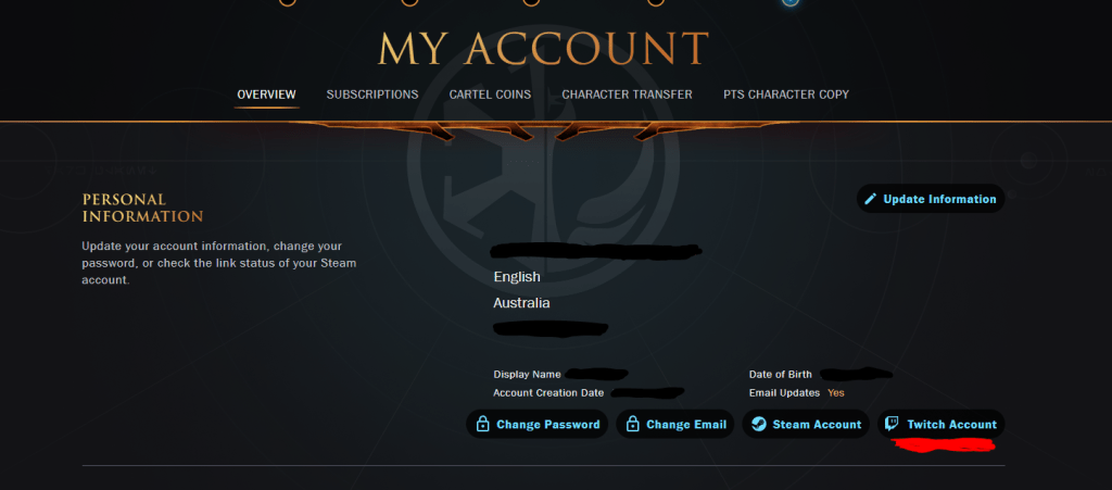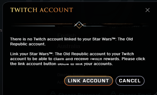 Once you have created or logged into your twitch account, open a new tab in the same browser and log into your account at swtor.com, go to the account page and click the twitch link button found next to the Steam link button.