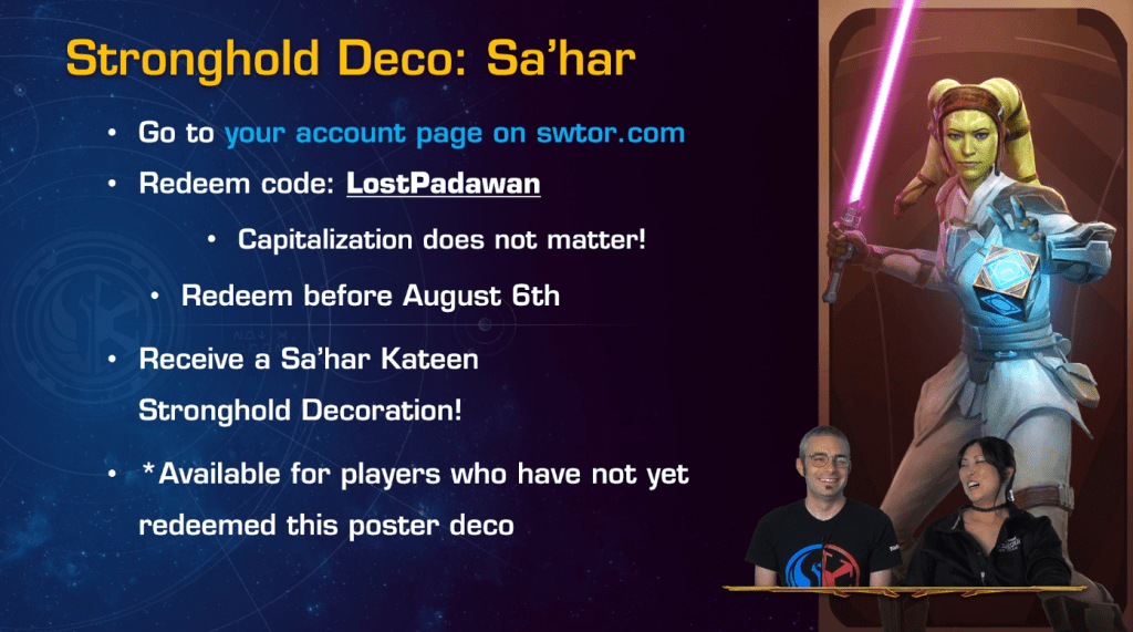 Go to swtor.com/redeem-code , log-in to your account and use the code LostPadawan before August 6th to recieve a Sahar poster decorations.