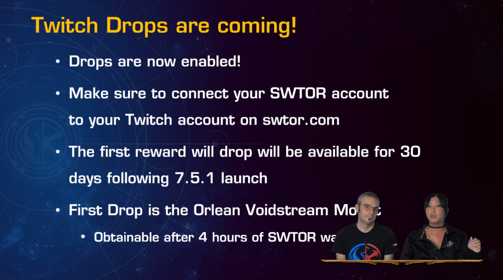 Eric Musco and Jackie Ko kicked off an Official SWTOR Livestream on the 24th of July and revealed that the team at Broadsword (previously Bioware) has SWTOR Content planned for August 7.5.1 and teased new Content.