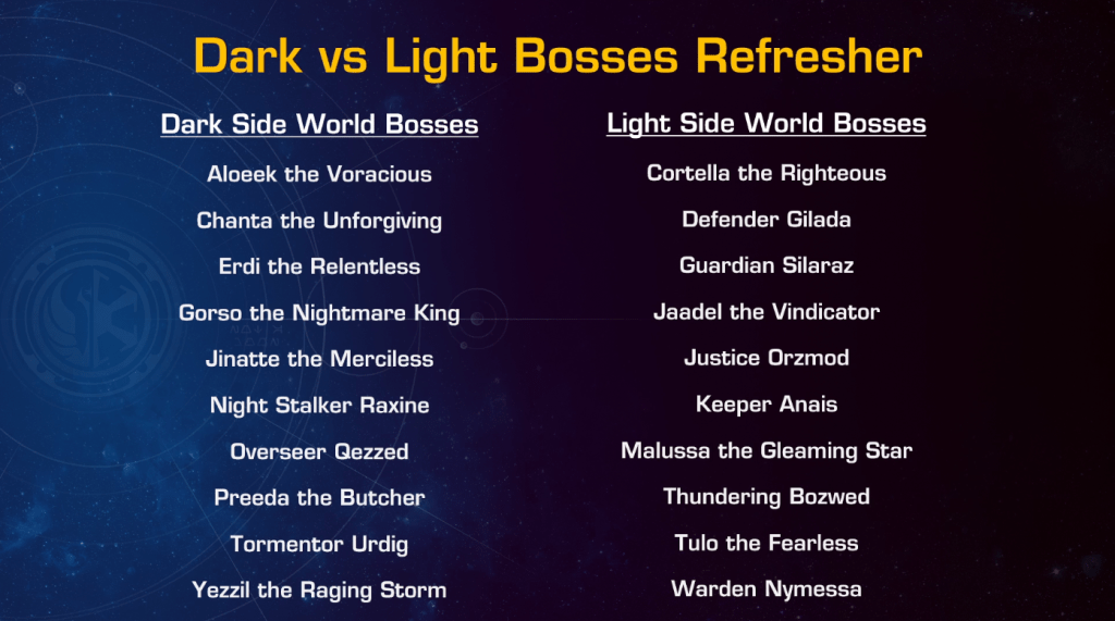 During this season Broadsword has reintroduced the DvL Worldbosses! These bosses take around 8-16 players to kill and drop Dark and Light tokens which can be exchanged on the fleet for rare cosmetics. A system introduced 9 years ago to SWTOR that was removed 2 years ago at the start of Legacy of the Sith.