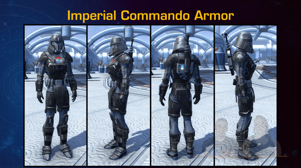 The Imperial Commando Armor is based on existing Imperial NPC Trooper gear in SWTOR with Lieutenant Pierce’s spec ops icon on the shoulderpads. It has previously been available to NPCs only with players requiring Makeb Reputation to obtain similar-ish looking armor.