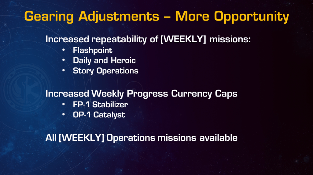 Essentially, all operations weeklies will now be available, and for ALL existing PVE weeklies, you will be able to choose between your current reward (gear/currency cache) OR you will be able to choose a special cache for a more advanced piece of gear.