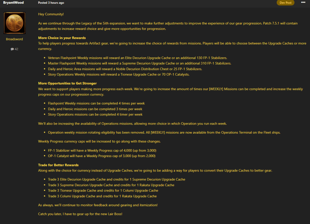 SWTOR 7.5 Desperate Defiance Update News