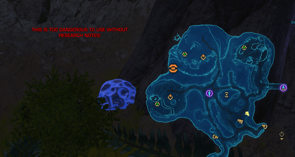 The Spore-Coated Mass appears as a bright blue, brain-like fungus and can be found all across the large round rooms of the Sporefall Biome, it can usually be found along the edges of the Biome, behind trees or inside bushes and under rocks.