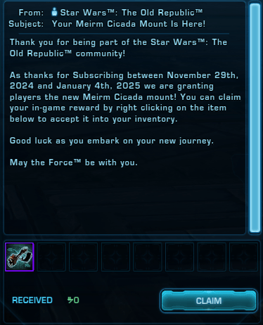 The Meirm Cicada Mount is a subscriber reward in Star Wars the Old Republic granted to all subscribed accounts between the 29th of November 2024 and the 4th of January 2025 after 7.6 releases in December 2024.