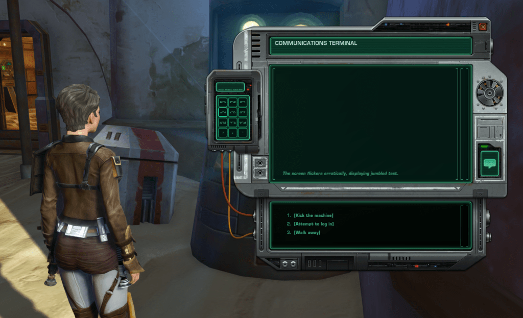 Hint: Choose to Kick Machine, Username Tatooine Password S4nd, Communications, Disable Data.