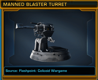 Completing the Colicoid Wargames Flashpoint on any difficulty has a chance to reward you with the Manned Blaster Turret as a Reward when you defeat the Final Boss of the Flashpoint.
