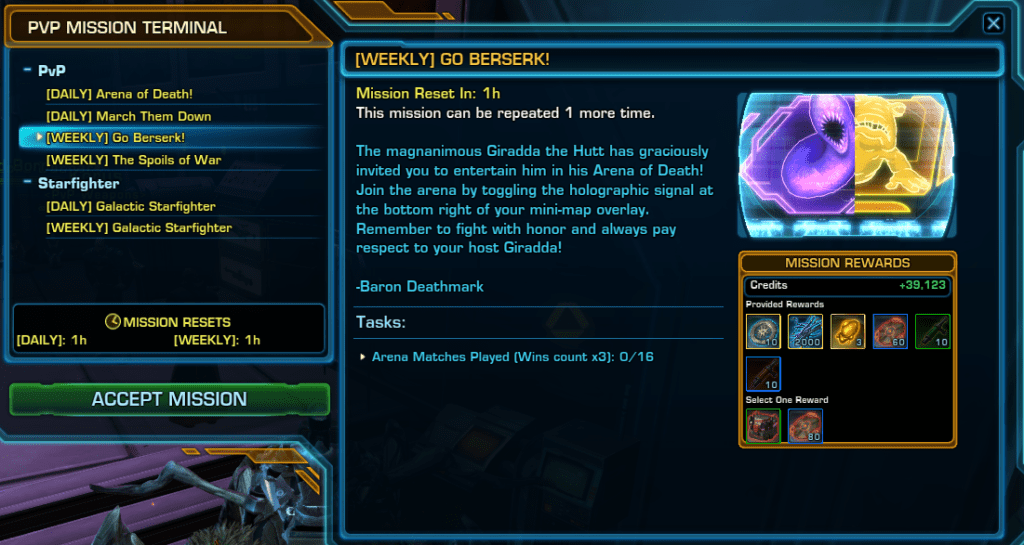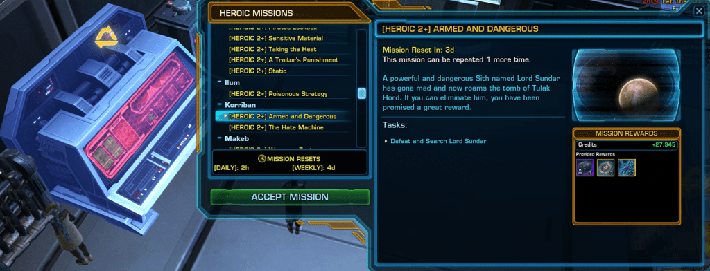 Completing the [Weekly] Belsavis Heroic Missions as an Imperial Player is one of the fastest ways for Free to Play or Solo players to quickly earn 888 Thousand Credits without selling any items or using the GTN.
