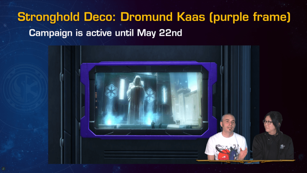 Watch 1 Hour of SWTOR livestreams with an actively connected swtor.com and twitch.tv account until May 2nd to unlock the Dromund Kaas decoration.