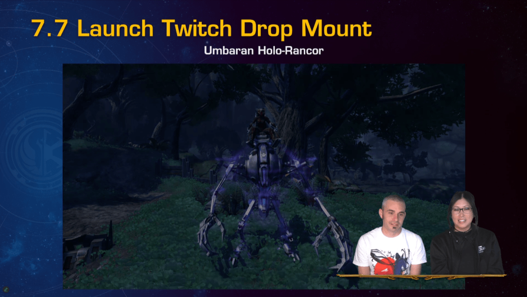 Players for the launch of 7.7 on May 28th can watch 5 hours of livestreams to unlock the Purple Holo-Rancor mount