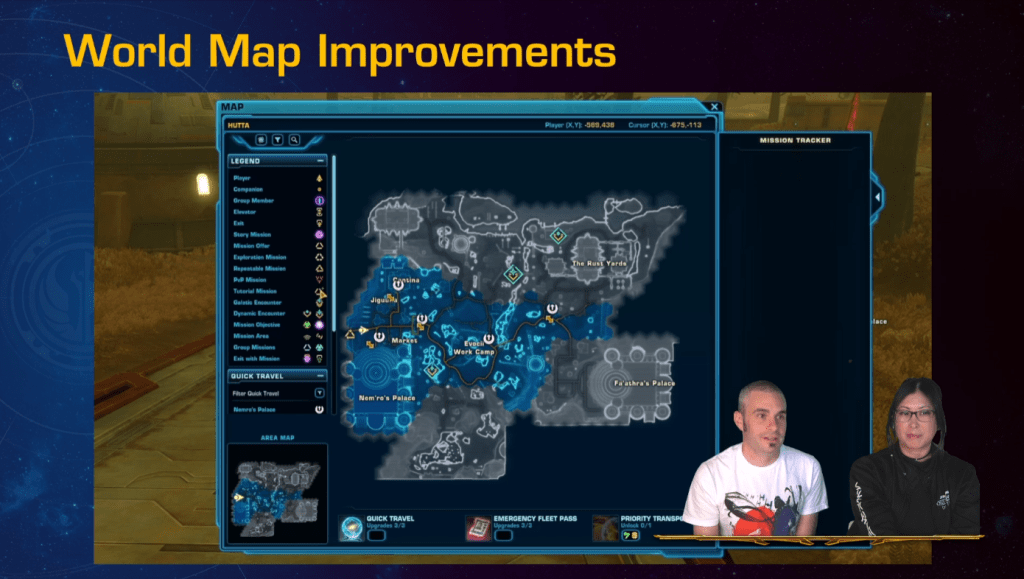 The Mission Log has been updated to show clearly defined planets, ‘purple’ quests have been reduced and are now more focused on actual critical path of story quests rather then planetary world quests. The new map includes easy tracker buttons and immediate travel buttons to teleport you right to the planet/location of the quest.