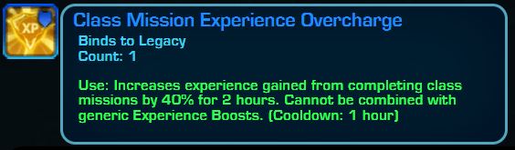 Use: Increases experience gained from completing class missions by 40% for 2 hours. Cannot be combined with generic Experience Boosts. (Cooldown: 1 hour)
