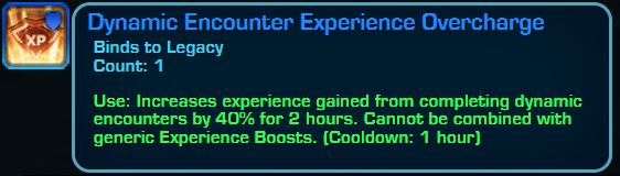 Use: Increases experience gained from completing dynamic encounters by 40% for 2 hours. Cannot be combined with generic Experience Boosts. (Cooldown: 1 hour)