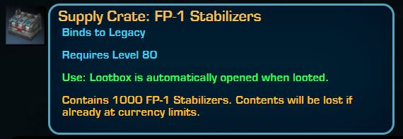 Requires Level 80 and Bound to Legacy: Contains 1000 FP-1 Stabilizers. All 1000 FP-1 Stabilizers are automatically looted the moment you RIGHT CLICK on the box.