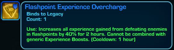 Use: Increases all experience gained from defeating enemies in flashpoints by 40% for 2 hours. Cannot be combined with generic Experience Boosts. (Cooldown: 1 hour)