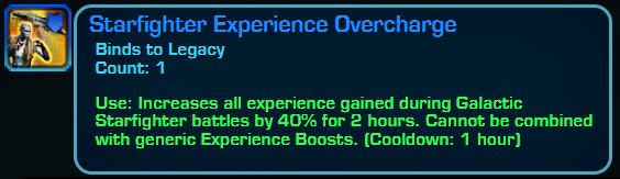 Use: Increases all experience gained during Galactic Starfighter battles by 40% for 2 hours. Cannot be combined with generic Experience Boosts. (Cooldown: 1 hour)